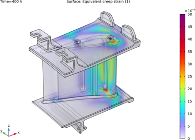 本例演示如何计算涡轮静叶片次级蠕变引起的变形。蠕变率受温度的影响很大,因此变形和应力松弛由温度场控制。