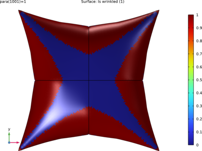 本例使用压缩空气对一个由超弹性、可压缩的 neo-Hookean 材料制成的方形安全气囊进行充气。压应力会在薄安全气囊的某些区域引发起皱。