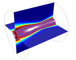 高斯光束射入 BK-7 光学玻璃,材料的折射率与光束强度相关,在光束中心,折射率最大。感应折射率剖面抵消了衍射效应,实际上使光束聚焦。自聚焦在高功率激光系统的设计中非常重要。模型演示了三维非线性波的传播。
