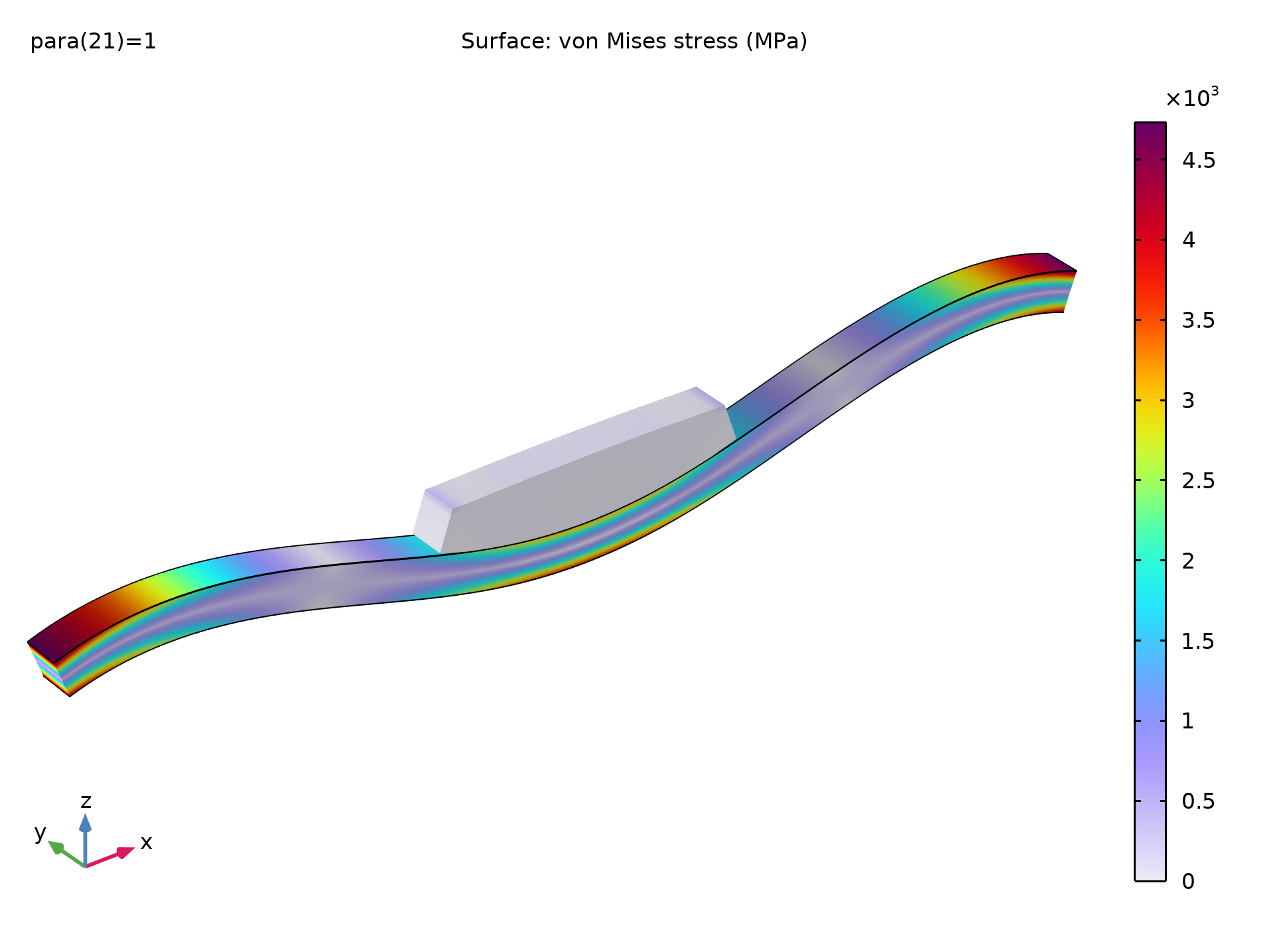 这个概念性示例演示了如何计算接触模型中的临界点。模型模拟了一个块体挤压拱的情况,其中通过“固体力学”接口为块体建模,通过“壳”接口为拱建模,采用增广拉格朗日方法求解接触问题。块体承受位移控制的边界载荷,并逐渐对拱产生挤压作用。在载荷增大过程中,拱发生突弹跳变现象,但我们仍然可以得到稳态解。