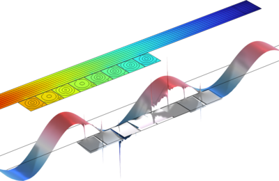 此模型演示如何计算切向背景流场中声学衬垫的声学属性。衬垫由八个带狭缝的谐振器组成,背景切线流的马赫数为 0.3。模型计算衬垫上方的声压级,并将计算结果与已发表的研究论文中的结果进行比较。