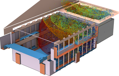 本模型采用射线追踪方法模拟柏林音乐厅小厅的声学效果。在 1/3 倍频带对房间进行全面的研究,其中包含 10 对源-接收器位置。本例根据计算得到的脉冲响应派生出室内声学参数,并将结果与室内声学仿真的循环研究的测量数据进行比较。