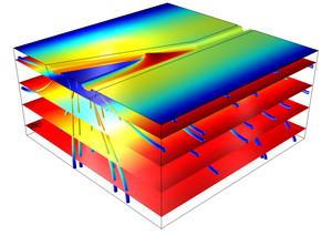 多孔弹性仿真计算与抽水相关的三维压实,其中通过利用达西定律获取地下流体流动,并将其与通过应力-应变分析得到的结构位移相耦合。此模型着重分析了抽水开始后流体压力变化引起的弹性位移。