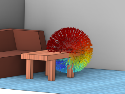本模型结合了压力声学和射线声学,对小型智能扬声器进行全频率范围的房间脉冲响应分析。模型中采用换能器的完整多物理场模型来描述射线追踪模型的源特性,并使用基于外场计算释放 特征来设置换能器源。