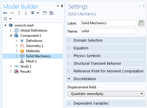 除上述方法外,还可以(尽管相对少见)研究改变单元阶次的效果。请参见:Understanding, and changing, the element order。每个物理场接口都会定义用于在每个单元内近似场的单元阶次,可通过离散化设置进行升阶或降阶,如下图所示。提高离散化会显著增加内存使用量。在多物理场模型中更改此设置时需特别注意,尤其是不同物理场可能需要采用不同单元阶次。另请参见:追踪多物理场模型中的单元阶次。