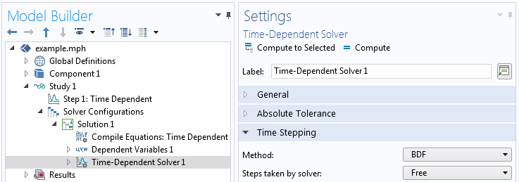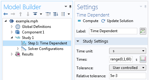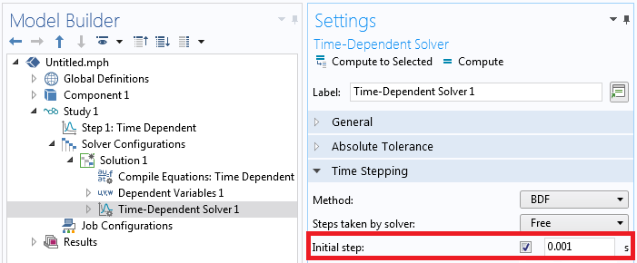 在使用自适应时间步进(使用任意求解器方法)时,软件会自动调整所用的时间步长,以满足所需的相对容差。尽管在这种情况下,精确选择时间步长相当复杂,并且无法直接控制,但您可以控制相对容差,如下面的屏幕截图所示。您应该总是执行容差细化研究:用更严格的容差重新求解模型并比较结果。