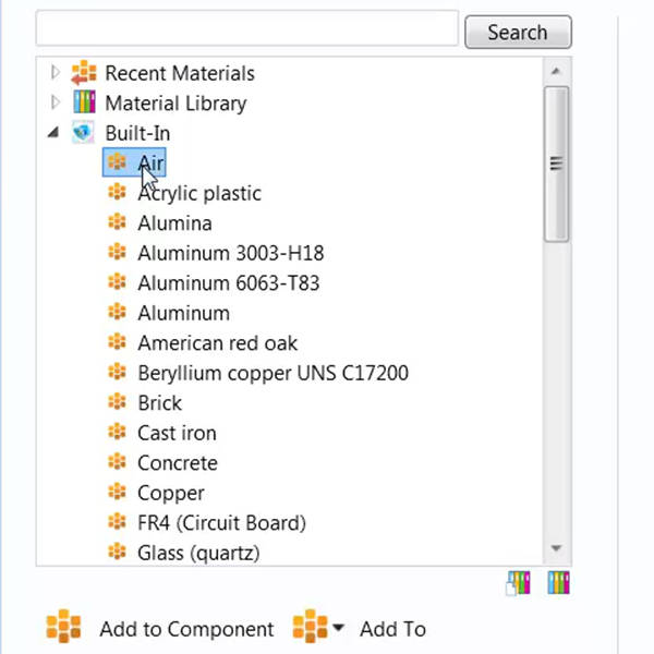 材料扫描 研究可以求解已指定材料的模型,并能为每种材料对模型产生的影响提供对比结果。实现此操作的步骤包括:添加材料开关 节点、指定要切换的材料,然后将“材料扫描”添加到研究中。